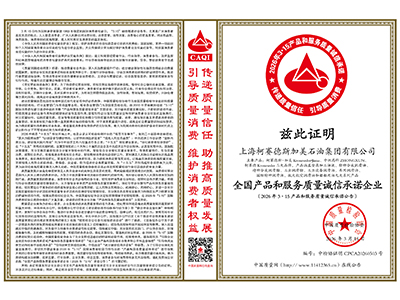 诚信,是企业立身之本;质量,是企业发展之基。上海柯赛德斯加美石油集团有限公司将以此次入选“全国产品和服务质量诚信承诺企业”为新的起点,继续秉持“驰骋能量,信赖之选”的品牌承诺,以军工品质铸就质量丰碑,以诚信服务守护消费者信任,为推动润滑油行业高质量发展、助力中国制造转型升级贡献更大力量!